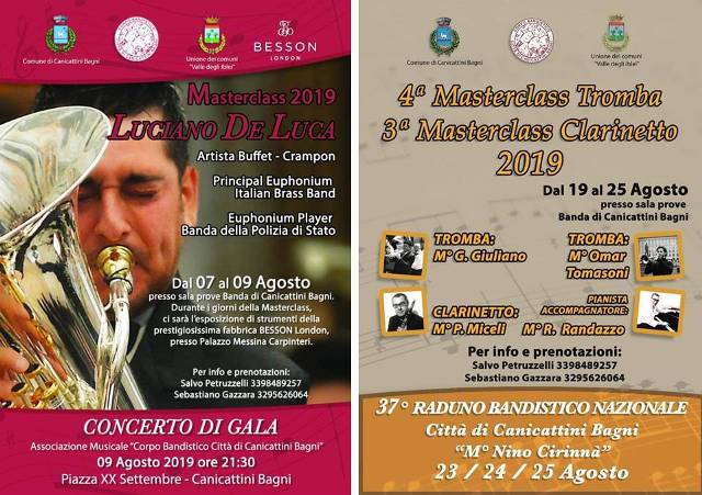 A dirigere il Masterclass riservato all’Euphonium, alla Tuba e al Trombone, che si terrà dal 7 al 9 Agosto presso la sala prove della Banda di Canicattini Bagni in via Pr. Jolanda 51, sarà il M° Luciano De Luca, “artista Buffet Crampon”, principal Euphonium nella “Italian Brass Band”, vincitore delle audizioni presso l'Orchestra del Teatro dell'Opera di Roma, l'Orchestra della Città di Rouen in Francia e l'Orchestra Sinfonica di Roma (Arts Accademy), nonché vincitore del concorso nazionale per Euphonium presso la Banda Musicale della Polizia di Stato.