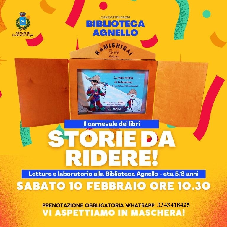 Carnevale dei libri in Biblioteca a Canicattini Bagni per i bambini dai 5 agli 8 anni con “Storie da Ridere” e laboratori, sabato 10 febbraio ore 10:30