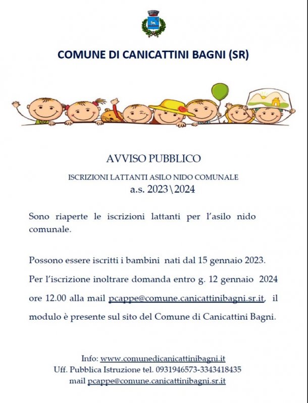 Riaperte le iscrizioni per la sezione “lattanti†all’Asilo Nido comunale di Canicattini Bagni, scadenza il 12 gennaio 2024